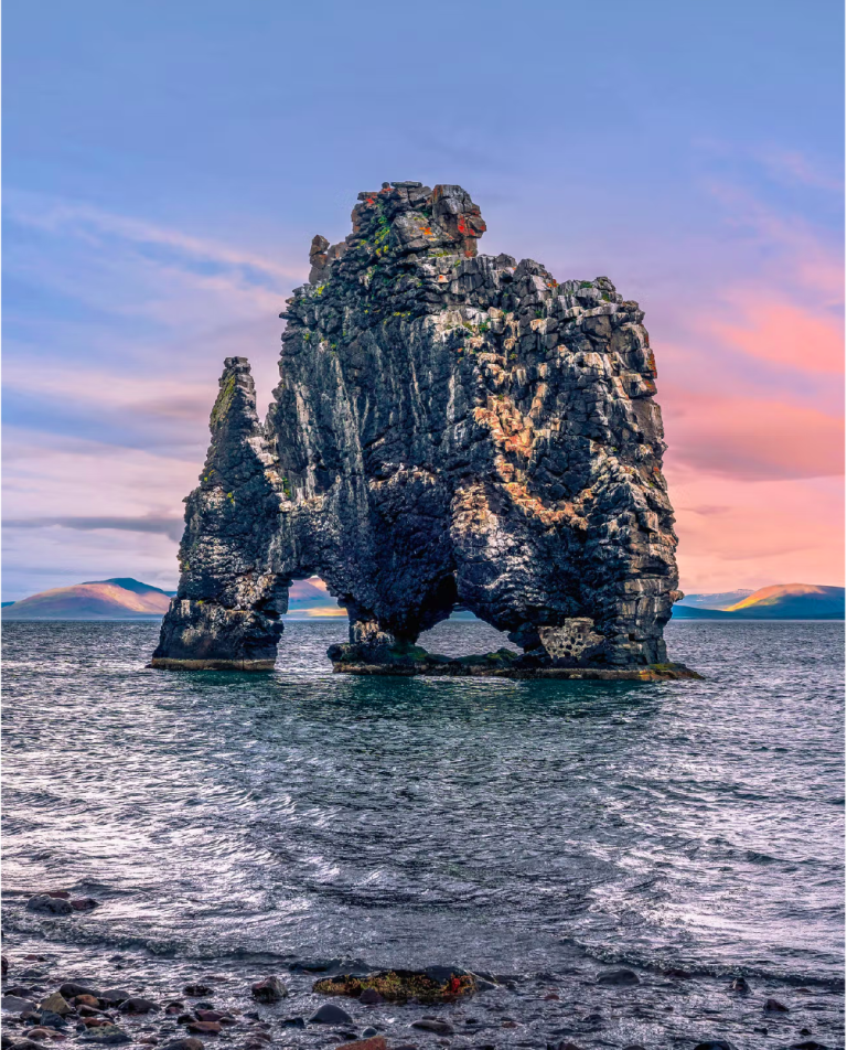 Vistas panorámicas en Helgafell y el impresionante farallón Hvítserkur, con forma de dragón. Noche en Stykkisholmur.